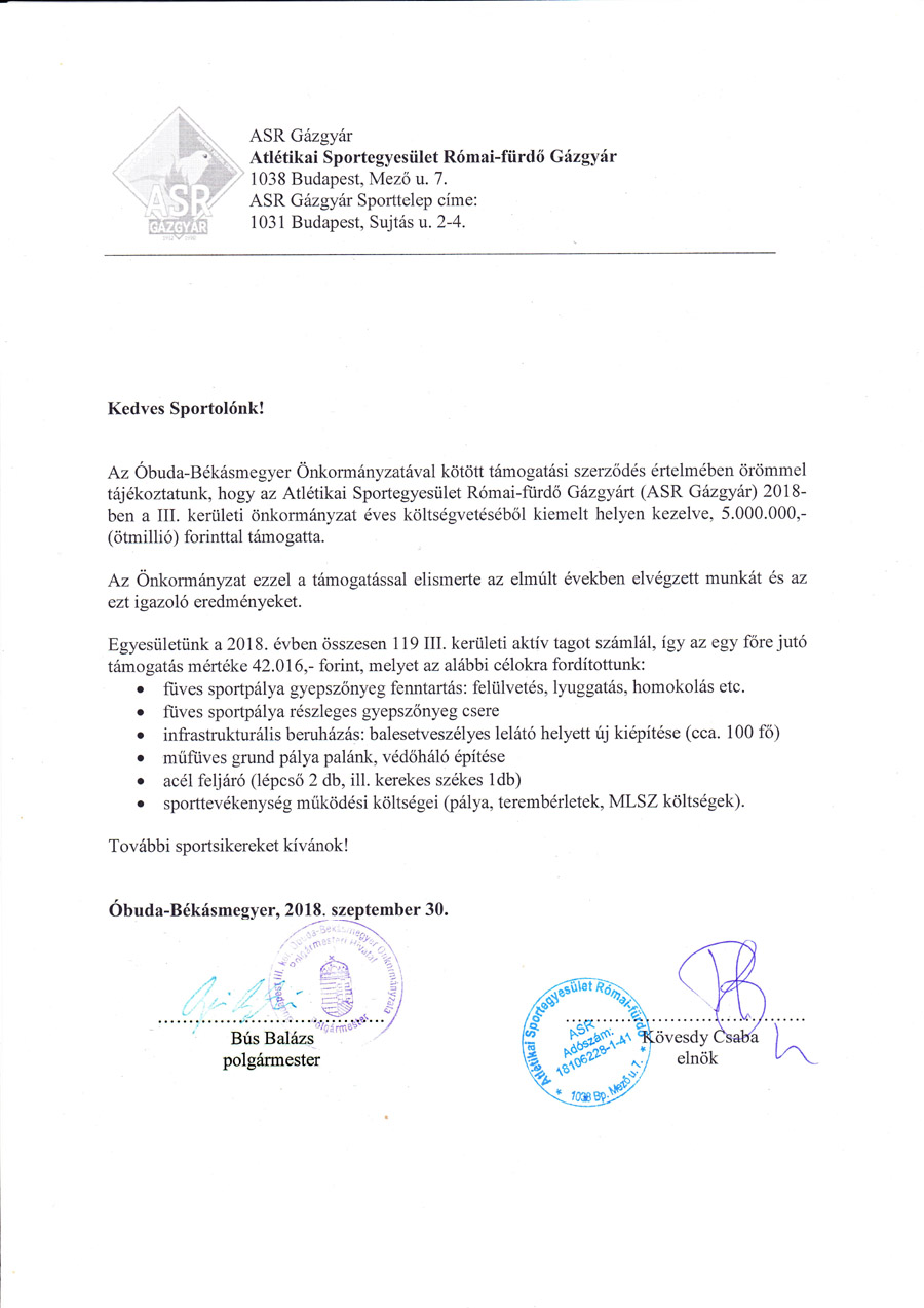 Tájékoztató levél egyesületünk önkormányzati támogatásáról